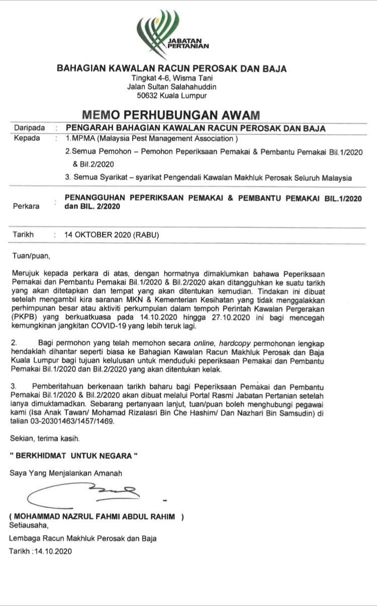 Jabatan Pertanian Malaysia On Twitter Penangguhan Peperiksaan Pemakai Amp Pembantu Pemakai Racun Makhluk Perosak Bil 1 2020 Dan Bil 2 2020 Keputusan Ini Dibuat Setelah Mengambil Kira Saranan Mknjpm Amp Kkmputrajaya Dalam Tempoh Pkpb
